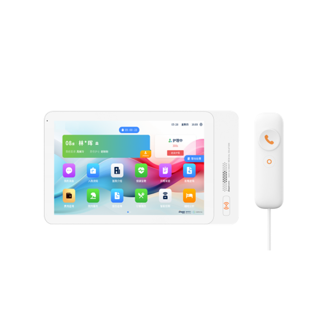 安裝在病床頭的交互設備機,代替?zhèn)鹘y(tǒng)紙質(zhì)卡。產(chǎn)品支持呼叫對講、為住院患者提供病例查詢、狀態(tài)自動提醒等護理需求等。